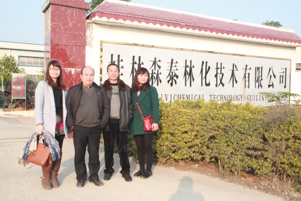 桂林興松林化總經(jīng)理唐春潮(左二)介紹工廠情況