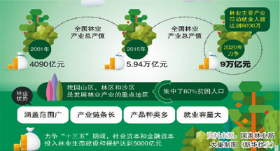 數(shù)字顯示,全國林業(yè)產(chǎn)業(yè)總產(chǎn)值已由2001年的4090億元增加到2015年的5.94萬億元,15年間增長(zhǎng)了13.5倍,我國已成為世界上林業(yè)產(chǎn)業(yè)發(fā)展最快的國家和世界林產(chǎn)品生產(chǎn)、貿(mào)易、消費(fèi)第一大國。