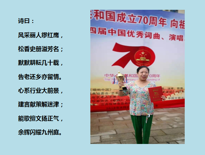 筆者注:在松香行業(yè),有一位大家耳熟能詳?shù)柠惾?,她的名字叫繆紅鷹,曾在松香界默默耕耘、誠信經(jīng)營了幾十載;退休后,她仍心系行業(yè)前途,常為行業(yè)發(fā)展建言獻(xiàn)策;她又能歌善舞,擅長詩賦,一身正氣,時常著文宣揚世間正能量; 其巾幗不讓須眉,贏得業(yè)內(nèi)的崇敬與贊揚!