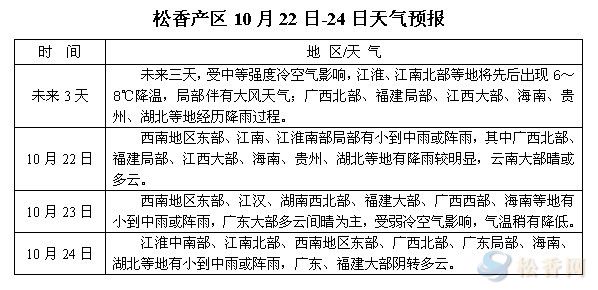 華訊松香網(wǎng)溫馨提醒:未來三日,受中等強(qiáng)度冷空氣影響,江淮、江南北部等地將先后出現(xiàn)不同程度降溫,局部伴有大風(fēng)天氣,廣西北部、福建。江西、貴州桂等地局部有小到中雨或陣雨,廣西中南部、廣東、云南大部晴或多云天氣為主。進(jìn)入十月下旬,多數(shù)產(chǎn)區(qū)氣溫趨低,江西、福建、湖北、貴州等地迎來最后一波松脂采收時期,預(yù)計到本月底或下月初下一批松脂將陸續(xù)下山。在無利多因素刺激下,本周兩廣、江西、福建等地松脂或仍緩慢流出,而云南隨著旺季深入,脂量或仍可保持小幅增長態(tài)勢。
