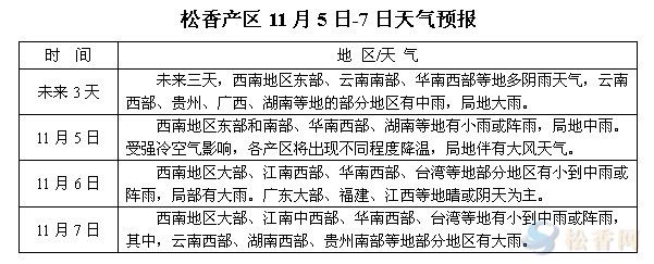 華訊松香網(wǎng)溫馨提醒:未來三日,云南西部、貴州、廣西、湖南等地的部分地區(qū)有中雨,局地大雨;粵閩贛大部地區(qū)晴或陰天為主。受強冷空氣影響,多數(shù)產(chǎn)區(qū)將迎來大風降溫天氣,采脂工的積極性或?qū)⑹苡绊?。松脂量方面,本周江西、福建等地最后一批松脂上市量或?qū)⒂兴黾?,云南地區(qū)隨著產(chǎn)季深入,脂量有望進一步增加;兩廣等地如無更多利好因素刺激,或延續(xù)前期緩慢釋放狀態(tài)。