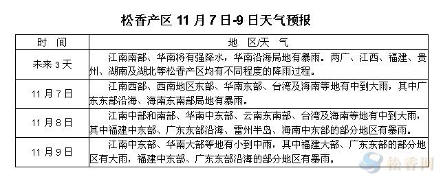 未來三天,各松香產區(qū)將迎來一次較強降雨過程,除云南外的其他松香產區(qū)均會受到不同程度的影響,同時降雨也會加速這些地區(qū)的降溫過程,若持續(xù)時間稍長,或將部分產區(qū)產季結束時間提前。另外,其他產區(qū)松脂市場受天氣影響有所波動,云南松脂量是否部分釋放還需根據(jù)整體市場情況而定。