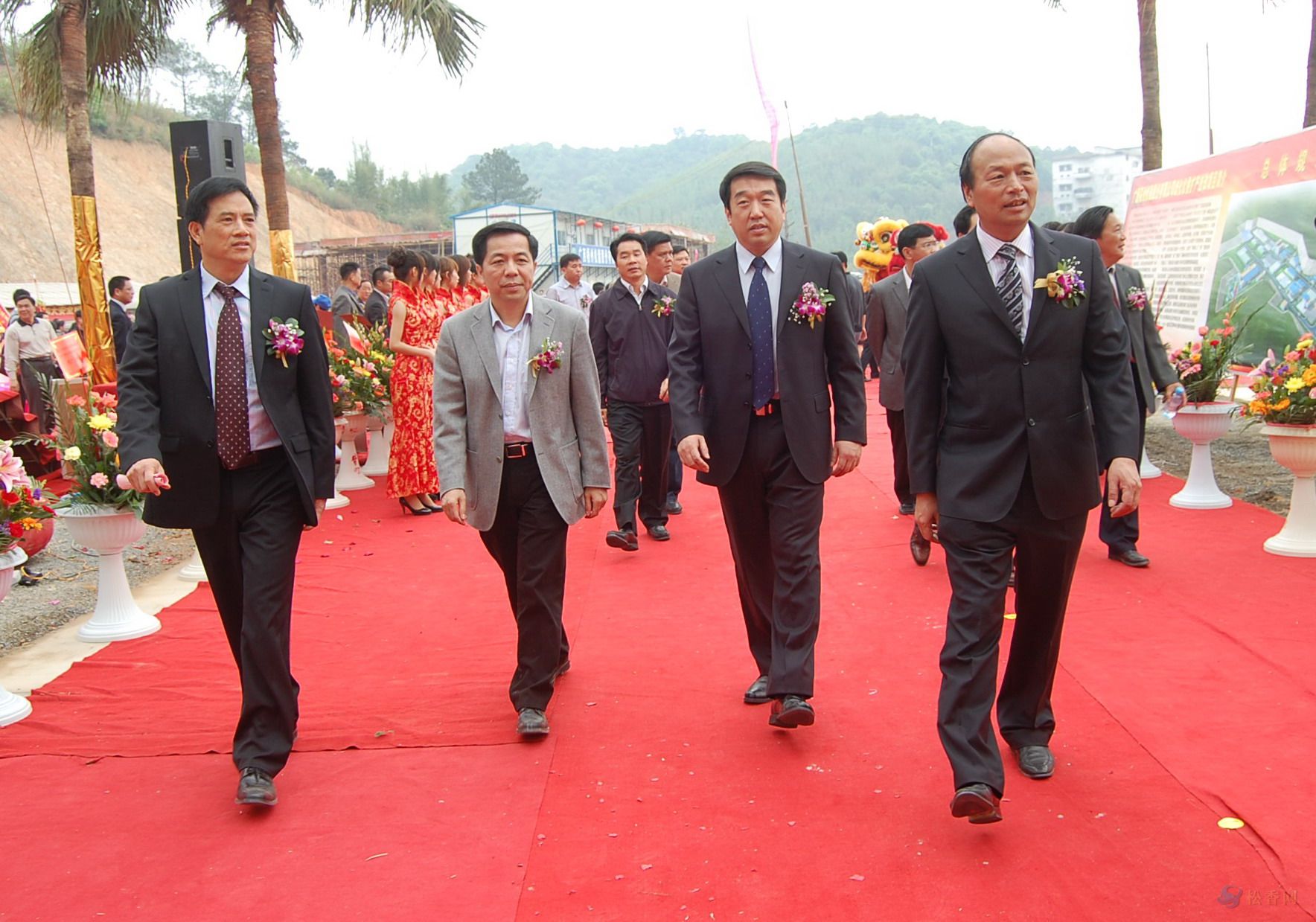 中共梧州市委書(shū)記劉志勇(右二)、廣西區(qū)工信委副主任潘峰(左二)于2010年3月31日在廣西梧州松脂股份有限公司歧化擴(kuò)產(chǎn)技改投產(chǎn)慶典儀式上與公司董事長(zhǎng)孔仕才(右一)總經(jīng)理車(chē)乾池(左一)在一起。