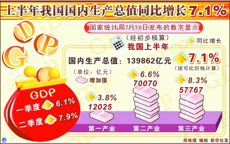 國家統(tǒng)計局?jǐn)?shù)據(jù)顯示,二季度中國經(jīng)濟(jì)同比增長7.9%,增速比一季度加快1.8個百分點。這樣,上半年中國經(jīng)濟(jì)同比增長率達(dá)到7.1%。