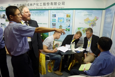 梧州日成林產(chǎn)化工參展人員在向外商介紹情況