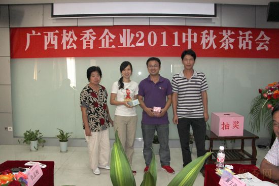 為了增加節(jié)日氣氛,廣西松香企業(yè)2011中秋茶話會還安排了抽獎環(huán)節(jié)。會前短信通知參會嘉賓攜帶名片,報名簽到時將名片交給工作人員,然后統(tǒng)一放到抽獎箱中以備抽獎使用。會上,先從三等獎開始,主持人抽出五名開獎嘉賓,然后他們每人抽取兩張名片,而名片的“主人”就是獲獎者。值得一提的是,開獎嘉賓南寧市東文工貿陳春生總經理居然抽到了自己的名片,參會嘉賓高呼“自摸”,將現(xiàn)場氣氛推向了高潮。