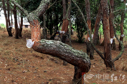 一陣山風(fēng)吹過,山野的松林“沙沙”作響,如泣似訴。凡有松樹處,無論粗細(xì)高矮,都難逃剝皮厄運(yùn)。那些松樹的樹干,無一例外地被剝?nèi)淦?,并割?ldquo;Y”字形刀口,“Y”字底部都有一個(gè)塑料袋,用于裝載汩汩滲出的松脂。