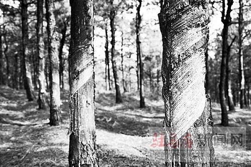 記者看到,整片松林中,沒有一棵松樹幸免于難。中王莊村民說,這些松樹幾乎每年都被割皮取松脂。“雖然松樹不會說話,但看著它們流下的松脂,覺得它們仿佛在不停地流淚。”村民王某說。