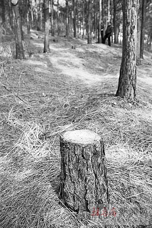 記者在采訪中還發(fā)現(xiàn),至少有20多棵直徑20厘米的松樹被砍伐,只留下樹樁。村民說,這些松樹大白天被人伐倒,然后裝車運(yùn)走,其實(shí),他們沒有砍伐證。