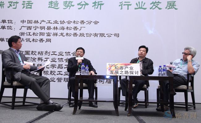 在第四分論壇《松香產(chǎn)業(yè)發(fā)展之路探討》中,主持人廣東富侍德化工有限公司總經(jīng)理宋力豐,與嘉賓美國MeadWestvaco資深博士胡克雄,廣東科茂化工有限公司董事長曾廣建,興國縣聯(lián)和化工有限公司董事長古遠亮等從資源、政策、市場三方面解讀中國松香產(chǎn)業(yè)將如何發(fā)展,由于本論壇內(nèi)容豐富精彩,會議延遲至六點三十分左右方才結(jié)束,論壇結(jié)束后,仍有不少參會代表前來與嘉賓交流相關(guān)市場情況或產(chǎn)品的前景走勢等。晚宴期間,部分參會代表仍圍繞論壇內(nèi)容或全球市場情況與論壇嘉賓進行探討交流。高峰論壇對話形式得到了參會代表的普遍好評,“頭腦風暴式”的思想碰撞,以全球視野審視市場走勢的觀點,全新的會議模式,得到了普遍的贊譽。