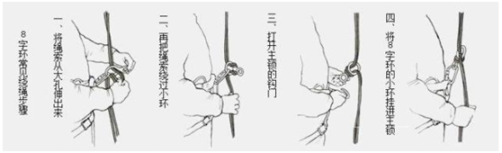 第二步:系好安全帶和8字環(huán)、掛扣相鏈接。將繩索從大孔伸出來,再把繩索繞過小環(huán),打開主鎖的鉤門,將8字環(huán)的小環(huán)掛進主鎖(如下圖)。