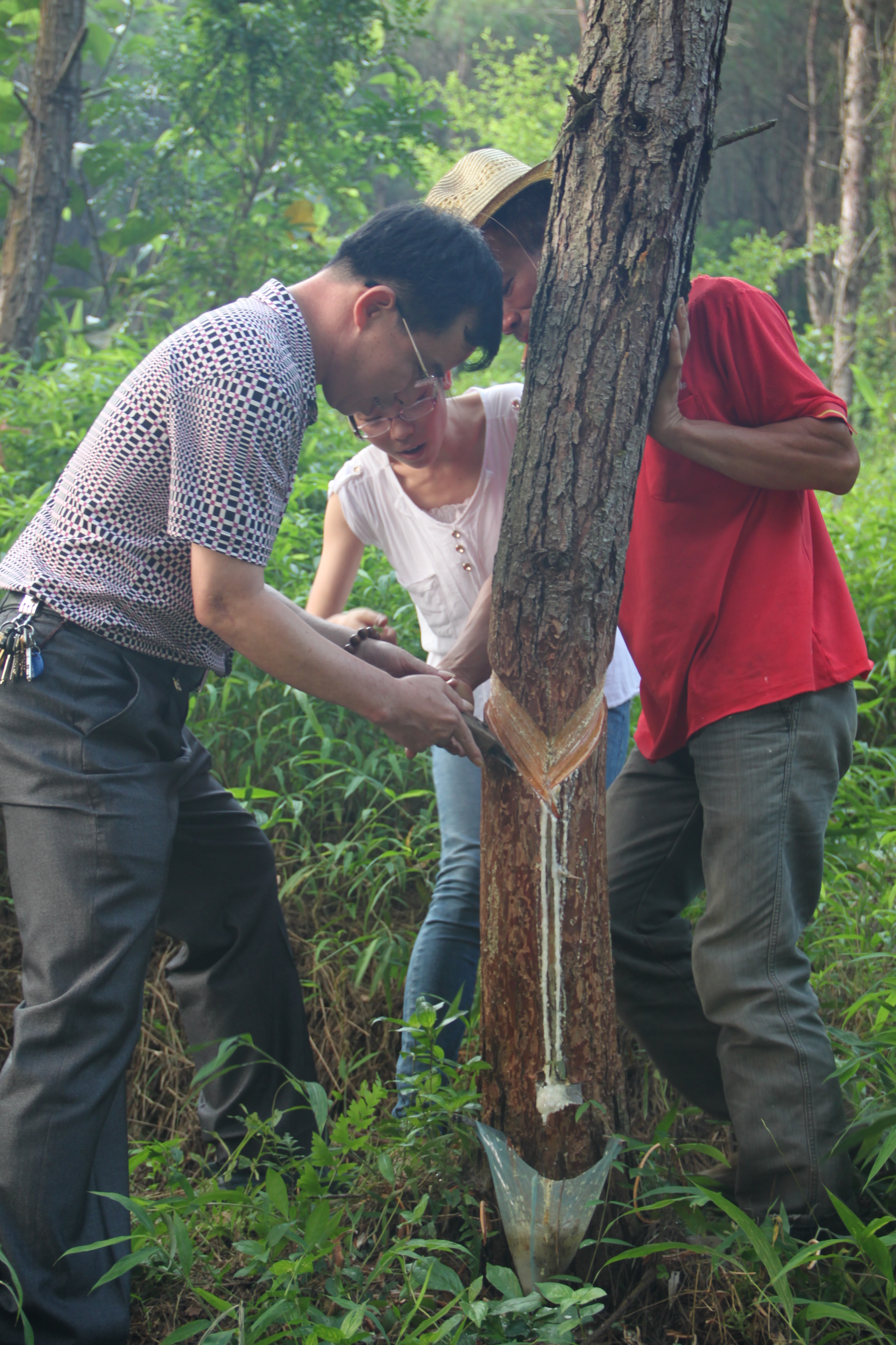在封開(kāi)縣的一片松林里,看完脂農(nóng)采脂,我們躍躍欲試,但無(wú)從下手。脂農(nóng)從割脂刀的握法、切割手法、力度和方向到切割的長(zhǎng)度、深度,一點(diǎn)一點(diǎn)向我們講解并示范。實(shí)際操作之后才發(fā)現(xiàn),采脂并不像看起來(lái)那么容易,處處都是學(xué)問(wèn),并且是一件極辛苦的體力活。在有幾十年從業(yè)經(jīng)驗(yàn)的他們面前,我們顯得如此笨拙,引導(dǎo)圍觀的脂農(nóng)笑聲不斷。