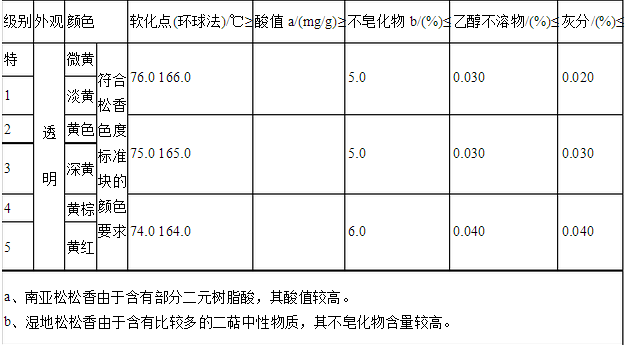松香檢驗標準生產的松香產品,質量標準執(zhí)行GB/8145-2003《脂松香》和GB/T8146-2003《松香試驗方法》國家標準。松香出廠應按GB/T 8146規(guī)定的試驗方法進行檢驗,每批產品應附產品檢驗單。松香包裝桶,應符合LY/T 1145的要求。 脂松香質量技術指標(GB/8145-2003)