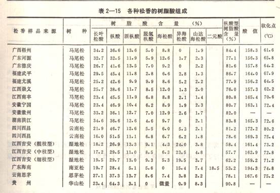 1 979年,中國(guó)林業(yè)科學(xué)研究院林產(chǎn)化學(xué)工業(yè)研究所在實(shí)驗(yàn)室分析了馬尾松、云南松、思茅松、華山松、濕地松松香的樹(shù)脂酸組成。松脂在減壓蒸餾(壓力200毫米汞柱)下收集松節(jié)油(相當(dāng)于松節(jié)油175℃左右的餾份)后,釜?dú)埣醋鳛樗上銟悠愤M(jìn)行樹(shù)脂酸含量的測(cè)定,其結(jié)果列于表2—15。由于松脂的含油量和蒸餾終點(diǎn)不一,因此松香的軟化點(diǎn)、酸值出入較大。