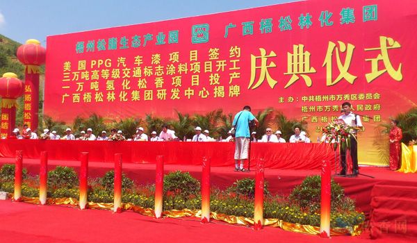 6月29日,梧州松脂生態(tài)產(chǎn)業(yè)園美國(guó)PPG汽車(chē)漆項(xiàng)目簽約、三萬(wàn)噸高等級(jí)交通標(biāo)志涂料項(xiàng)目開(kāi)工、一萬(wàn)噸氫化松香項(xiàng)目投產(chǎn)暨廣西梧松林化集團(tuán)研發(fā)中心揭牌儀式慶典在梧州松脂生態(tài)產(chǎn)業(yè)園舉行。華訊松香網(wǎng)記者受邀參加此次慶典并進(jìn)行現(xiàn)場(chǎng)報(bào)道。