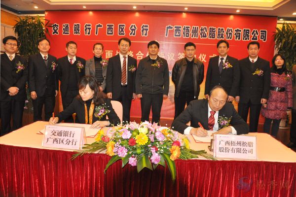 近日,交通銀行廣西區(qū)分行與廣西梧州松脂股份有限公司簽訂全面戰(zhàn)略合作協(xié)議,進(jìn)一步加強(qiáng)銀企之間在資金、籌備上市等方面合作,促進(jìn)梧州松脂產(chǎn)業(yè)發(fā)展壯大,加快廣西梧州松脂公司的上市進(jìn)程,實(shí)現(xiàn)銀企合作雙贏。