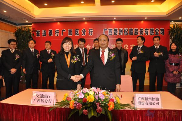 董事長(zhǎng)孔仕才(右)與交通銀行廣西分行趙紅蓮握手致意。