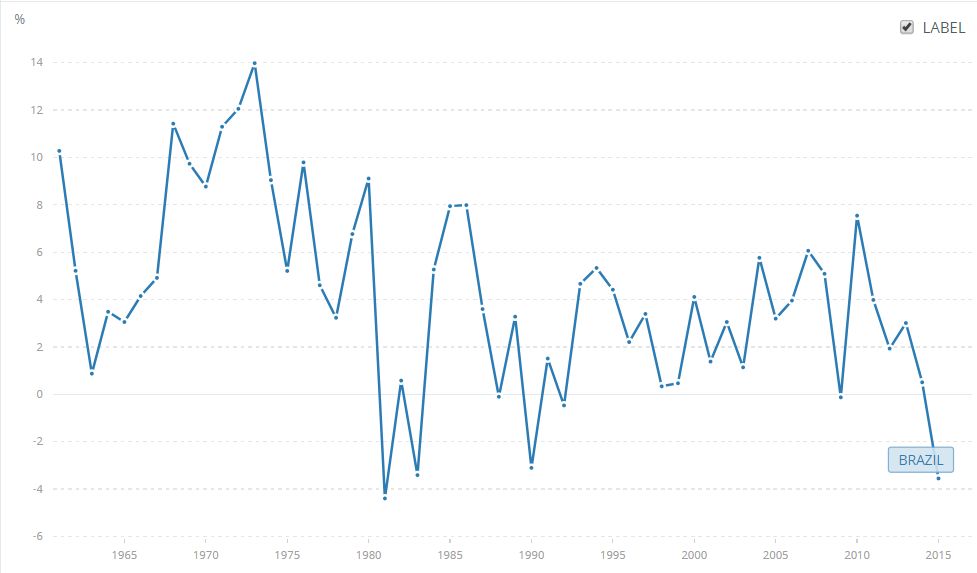隨后,在工業(yè)化的推動(dòng)下,巴西在1948€€1979年期間,GDP平均增長(zhǎng)率達(dá)7.2%,其中,1968€€1973年期間,更取得了10%以上的高速增長(zhǎng),被稱(chēng)為“巴西奇跡”。