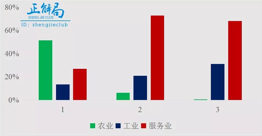 在我們的認(rèn)知里,一二三產(chǎn)業(yè)(簡(jiǎn)單對(duì)應(yīng)農(nóng)業(yè)、工業(yè)、服務(wù)業(yè)),越發(fā)達(dá)所占比重相應(yīng)越來(lái)越高。我們能確定國(guó)家1是尼泊爾,但是國(guó)家2、3呢?