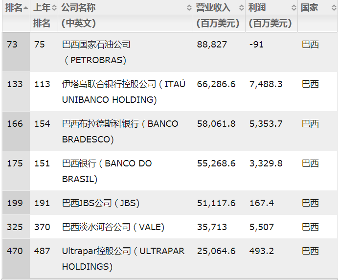 更直觀(guān)的反映是,在2018年福布斯世界企業(yè)500強(qiáng)中,巴西一共入圍7家,從名字就能看出來(lái)2-4位是金融企業(yè)。剩下的里面,巴西國(guó)家石油公司和Ultrapar控股公司,一個(gè)主業(yè)是石油,一個(gè)是天然氣,JBS是肉食加工企業(yè),淡水河谷是鐵礦石生產(chǎn)和出口商。