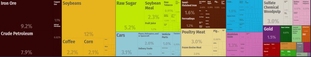 比如,前面說(shuō)過(guò)的巴西淡水河谷是全球最大鐵礦石出口商,。巴西還是全球最大的咖啡、牛肉、蔗糖、雞肉出口國(guó)。