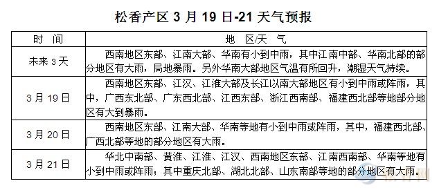 未來三天,廣東、江西及福建部分地區(qū)有大雨,局地暴雨,采脂工人及脂農(nóng)上山采脂準(zhǔn)備工作難以開展。華南大部分地區(qū)氣溫有所回升,但南風(fēng)天較普遍,上山人員仍將注意防雨防潮。云南旱區(qū)尚無降雨跡象,旱情持續(xù)。