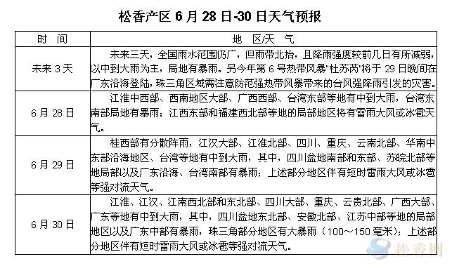 華訊松香網(wǎng)提醒:未來三天各主產(chǎn)區(qū)降雨天氣仍較頻繁,但隨雨帶北移,降雨強(qiáng)度較前有所減弱。29日,隨著強(qiáng)熱帶風(fēng)暴“杜蘇芮”將在廣東沿海登陸,兩廣等地或?qū)⒂瓉硇乱惠喗涤辍?月期間的連續(xù)降雨是影響松脂量的一個(gè)重要影響因素,即將進(jìn)入7月,各方仍需關(guān)注天氣、價(jià)格、心態(tài)等因素對松脂量的影響。