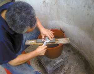 ▲一排松樹無一例外地被剝皮,并割出“Y”形刀口。 ▲一名采脂工在磨利用于采脂的工具。