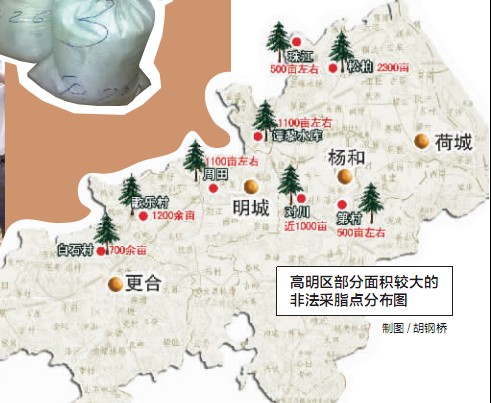 高明區(qū)部分面積較大的非法采脂點(diǎn)分布圖 制圖/胡鋼橋