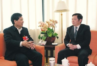 圖為云南省委書記秦光榮(左)接受本報記者采訪。本報記者 徐華 攝